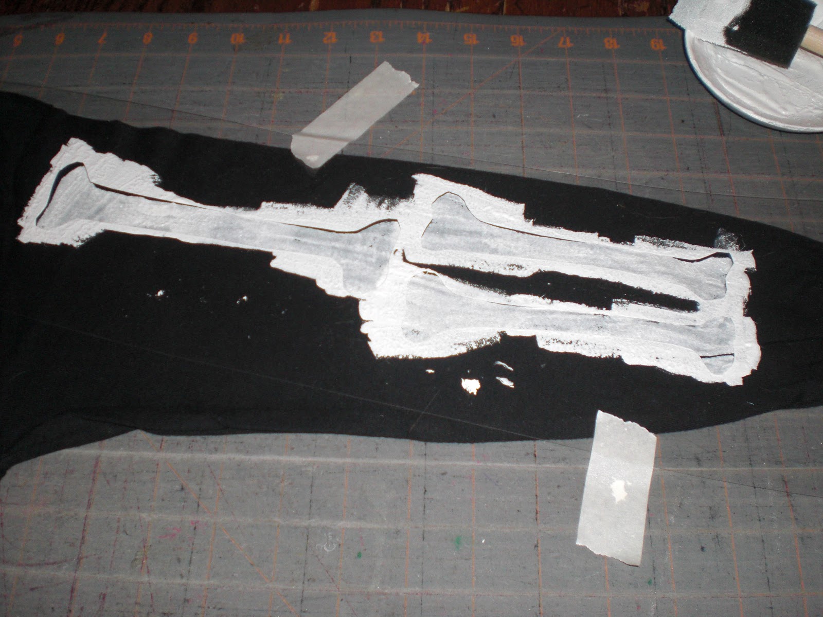 I knew just what to do. I would make some stencils and paint the rib cage and arm bones onto black shirts.