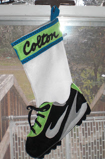 My grandson, Colton is only 2 but I am sure he will be a great football player someday, just like his dad. I made him a football cleat using Seahawk colors and the Nike swoosh.